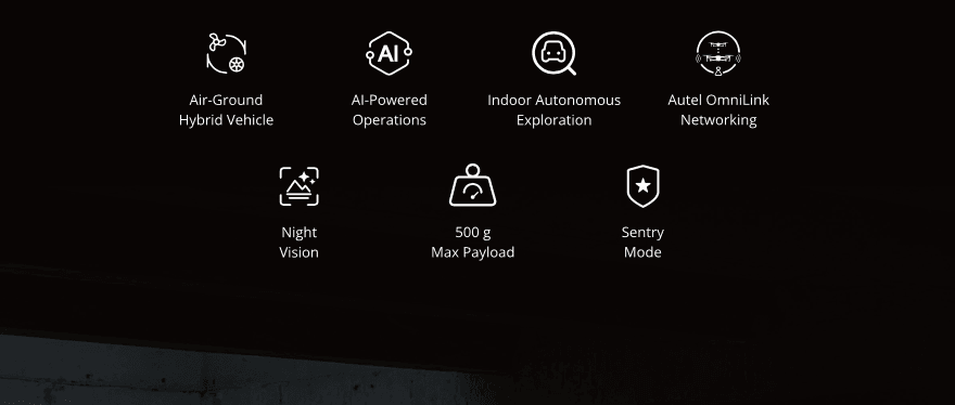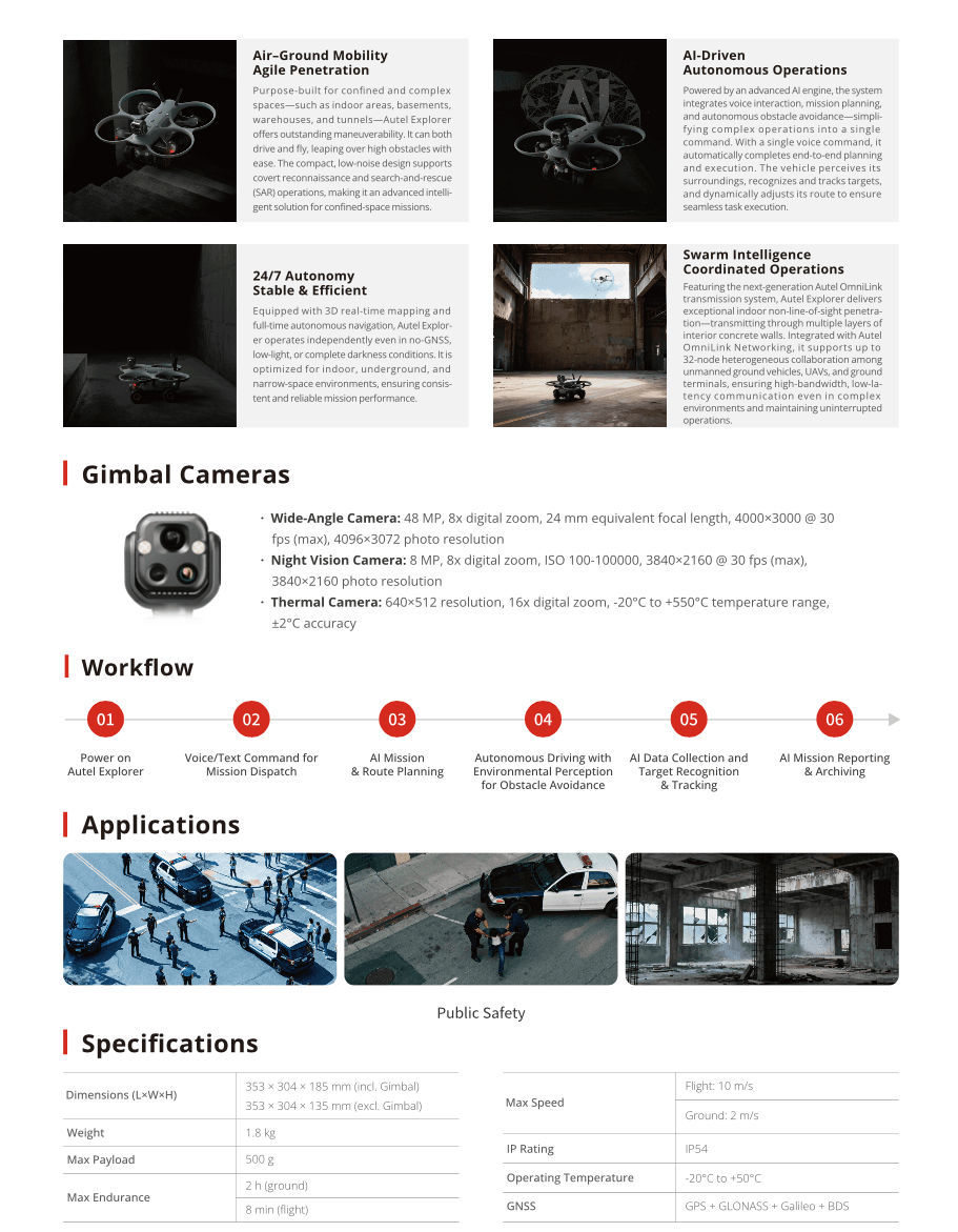 Autel Explorer to hybrydowy, inteligentny bezzałogowy pojazd powietrzno-naziemny do rozpoznania wnętrz, łączący w sobie mobilność naziemną i lot powietrzny. Obsługuje autonomiczne misje oparte na sztucznej inteligencji, tajne rozpoznanie i skoordynowane operacje roju. Pojedyncze polecenie głosowe uruchamia automatycznie pełne planowanie i wykonanie misji — nawet w warunkach braku oświetlenia i braku sygnału GNSS. Dzięki długiej wytrzymałości naziemnej i krótkiemu czasowi lotu, kompaktowej i lekkiej konstrukcji, Autel